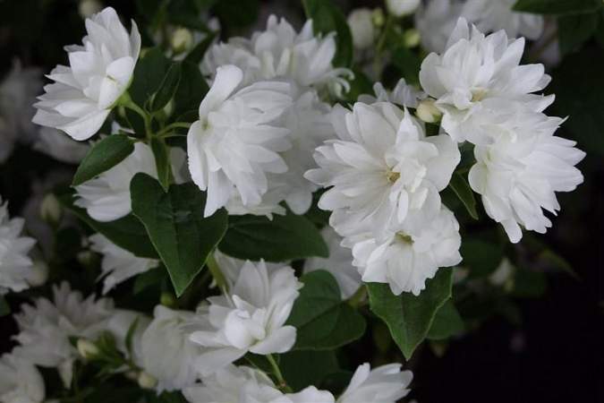 Чубушник 'Frosty Morn'. Высота до 1,5 м, ширина до 1 м; белые цветки с приятным сладким ароматом.