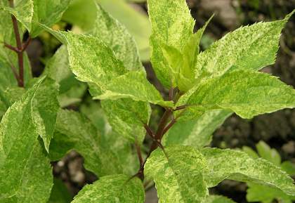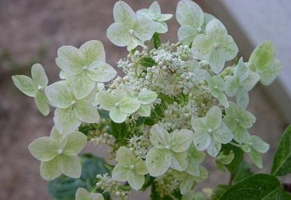 Гортензия метельчатая 'Shikoku Flash'. Высота около 1 м. Побеги шоколадно-бордового цвета. Стерильные цветки с зеленым крапом. Листья цвета шартрез с золотисто-кремовыми многочисленными штрихами. Цветение с июля по сентябрь. Нельзя сказать, что эта гортензия такая уж новинка. О ней известно уже довольно давно. Однако в широкой продаже ее до этого года не было.