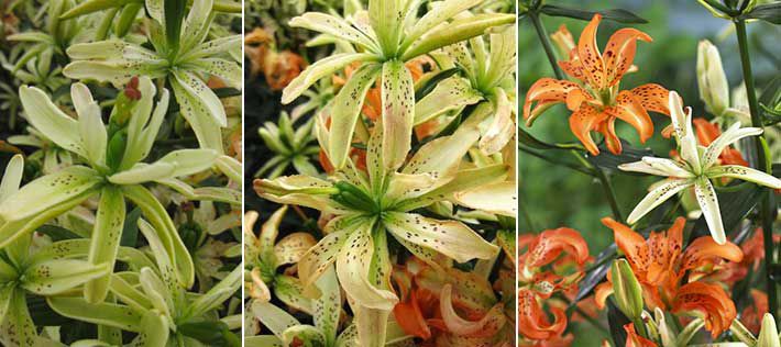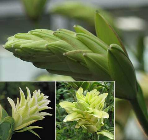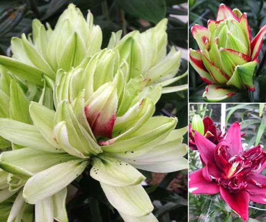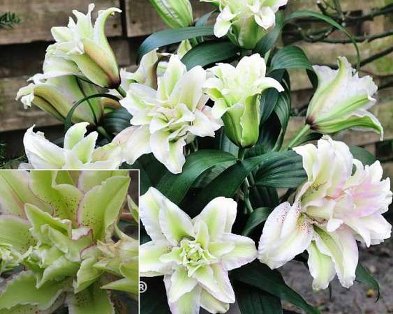 Из находок. Зеленая, махровая, на цветок не похожая не одна только 'Mystery'. ОТ-гибрид 'Doubleen' похожа уже не на артишок, а на колос. Еще одно бело-зеленое чудо-юдо — махровая восточная 'Annika'. Она входит в модную нынче серию Roselily, то есть лилии-розы. И наконец, зеленая растопырка 'Must See'. Тоже азиатский гибрид.