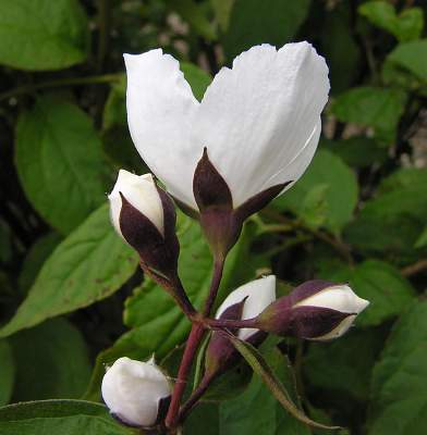 Чубушники нужны самые разные. Классические высокие сорта с ароматными цветками разве не прекрасны? А компактные новинки с махровыми помпончиками? И чему отдать предпочтение? Это сложный вопрос. Я бы обратила внимание на необычный сорт 'Starbright'. Молодые листья у него пурпурные. Побеги и чашелистики тоже. Зато цветки белоснежные. И контраст получается такой красивый.