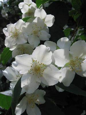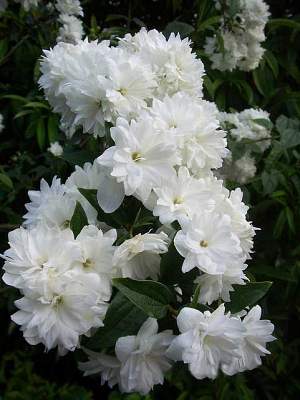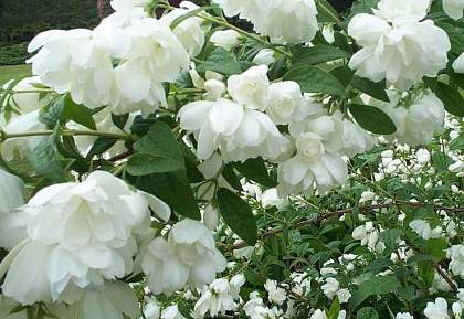 Чудесны и махровые сорта — 'Frosty Morn', 'Minnesota Snowflake', 'Snowbelle' и другие. 'Frosty' и 'Snowbelle' компактные сорта. Это очень удобно для небольших садов: можно позволить себе иметь несколько сортов садового жасмина.