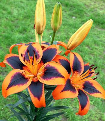 Лилия Easy Samba (Изи Самба). Азиатские гибриды. Цветок крупный, оранжевый с бордовым пятном по центру лепестка. Без пыльцы. Высота около 100 см.