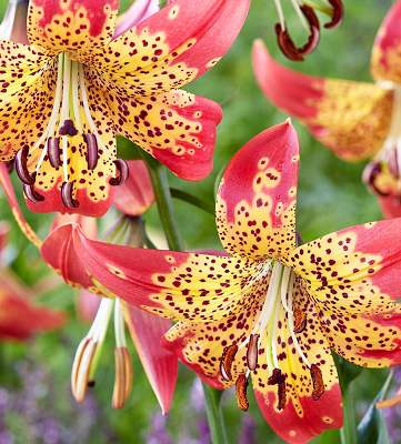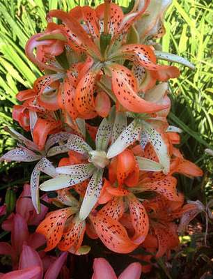 Лилия Fusion (Фьюжн). Гибрид Longiflorum x L.pardalinum. Цветок крупный, чалмовидный, лепестки оранжевые с темным крапом, кончики ярко-красные. Стебель мощный, высокий, несет множество цветков.