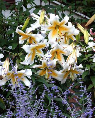 Лилия Mister Cas (Мистер Кас). ОТ-гибрид, лилия-"дерево". Цветки бело-желтые, очень крупные, направленные вниз. Лепестки волнистые, они элегантно отгибаются назад, открывая желто-оранжевый центр с продолговатыми пятнами. Высота растения до 90-120 см. Со временем эта лилия превратится в настоящего гиганта с 20 душистыми цветками около 20 см в диаметре.