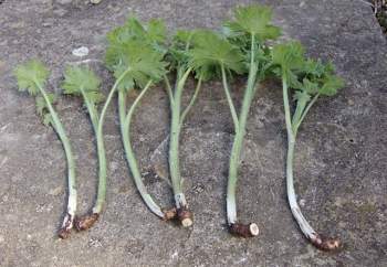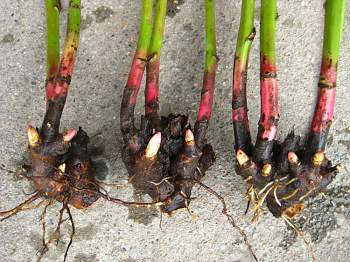 Чтобы получить весной такой черенок, надо разгрести основание куста и срезать (или выломать) побег вместе с кусочком корневища.