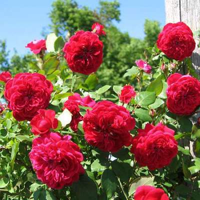 Роза серии Explorer. Темно-красные бутоны раскрываются в насыщенно красные цветки, слегка выгорающие до темно-розовых. Куст очень сильнорослый, может использоваться как плетистая роза. Устойчив к заболеваниям.