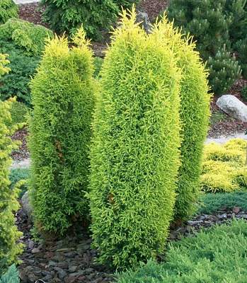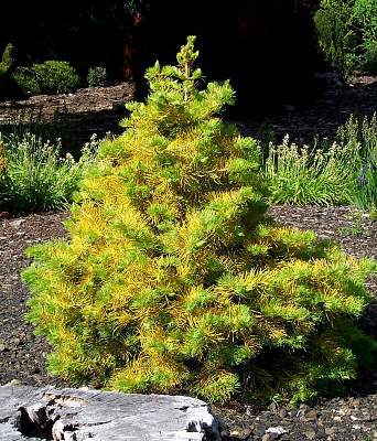 Коллекция хвойных просто роскошная. Огромный выбор сосен, елей, можжевельников, туй. Обратите внимание на пихту с желтой хвоей, тую с окраской "под зебру" и фантастическую сосну 'Sunshine', у которой кончики иголок желтого цвета. Она смотрится бесподобно!