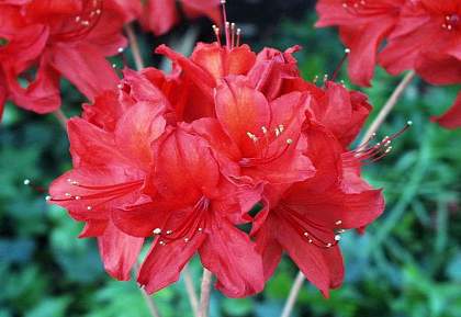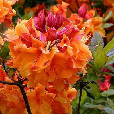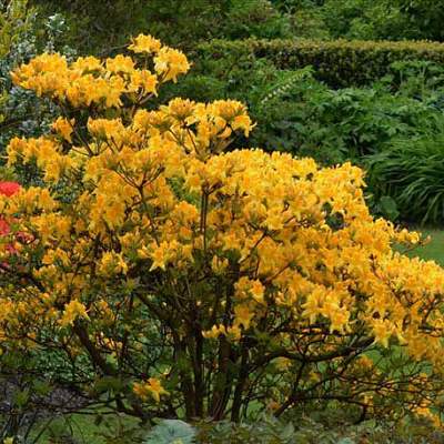 Особенно хороши, в нашей дополнительной поставке азалии. Это такие знаменитые сорта как 'Golden Lights', 'Homebush' и 'Sunte Nectarine'. Последний сорт — истинная звезда северных садов. Крупные, широко раскрытые золотисто-желтые цветки с оранжевым оттенком и огненной окраской с наружной стороны лепестков. Компактные соцветия имеют 7-15 цветков. Листья при распускании бронзовые, затем темно-зеленые, осенью малиново-красные, затем оранжево-желтые. Цветёт в мае-июне.
