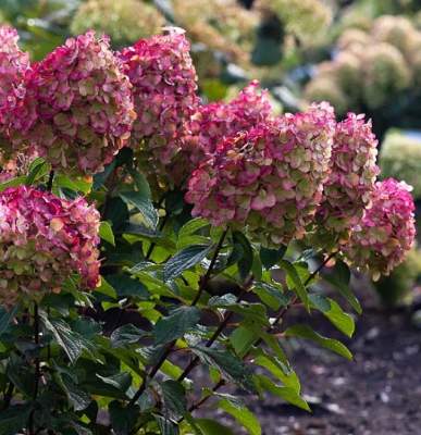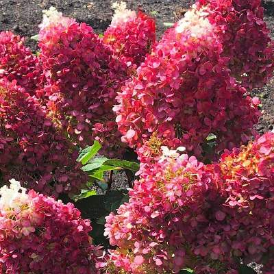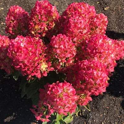 Гортензия метельчатая Indian Summer (Индиан Саммэ). Другое название этой гортензии — Sparkling Ruby (Сверкающий рубин). Новинка 2022 г. от Алекса Шумахера. Сорт имеет гармоничную форму куста — округлую, почти шаровидную. Высота 120 см. Диаметр 100 см. Соцветия крупные, состоят из стерильных цветков. Вначале они белые, затем розовеют и в конце цветения становятся ярко-малиновыми. Начинает цветение в июле.