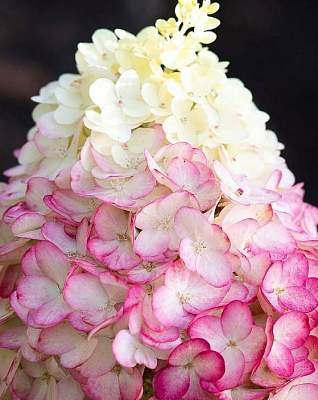 Гортензия Метельчатая Colourful Cocktail (Колорфул Коктейль). Новинка 2021 г. от Алекса Шумахера. Цветки сначала кремово-белые, затем розовеют и в конце становятся темно-розовыми. Побеги очень крепкие. Соцветия длиной до 35 см. Состоят в основном из стерильных цветков, поэтому они плотные. Сочетание компактного куста и очень крупных соцветий создает высокий декоративный эффект.