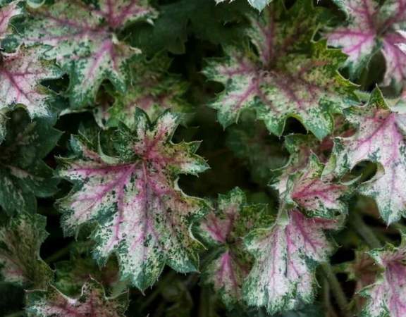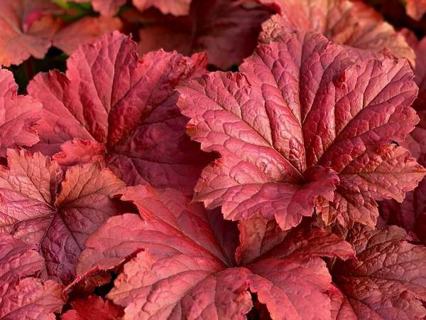 Гейхера Bloody Dinosaur (Блади Динозавр). Новинка. Крупная гейхера, высота около 40 см, диаметр взрослого растения до 60 см. Листья крупные, темно-красные с выраженными жилками. Цветет в июне-июле белыми цветками, собранными в соцветия. Предпочитает влажные рыхлые почвы и размещение в кружевной тени.