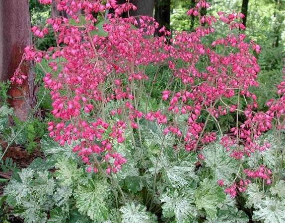 Гейхера Dew Drops (Дью Дропс). Новинка. Уникальный сорт. Листья зеленые с мраморным рисунком. Белый из центра брызгами разлетается к краям, прожилки розовые. Название переводится как "капли росы". Цветки ярко-красные. Хорошо нарастает. Высота в цвету 30 см. Диаметр 40 см.