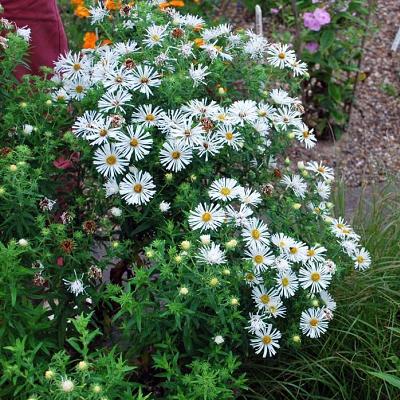 Астра Kristina (Кристина). Низкорослая, сама формирует округлую форму. Прекрасно дополняет яркие многолетники и сглаживает пестроту.
