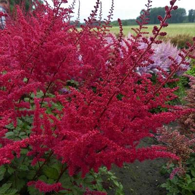 Астильба Red Skyscraper (Ред Скайскрейпер). Вишневые молодые листья и потрясающие ярко-красные соцветия. Цветоносы лаково-коричневые.