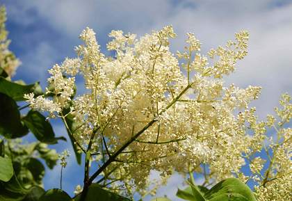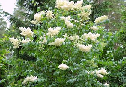Сирень амурская. Крупный кустарник или дерево с раскидистой густой кроной родом с Дальнего Востока. Зацветает на две недели позже сирени венгерской и на три недели позже сирени обыкновенной, удлиняя период цветения сиреней почти до конца июля. Цветёт очень обильно, душистыми белыми или кремоватыми соцветиями до 25 см длиной. Благодаря очень длинным тычинкам соцветия кажутся махровыми.