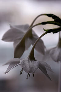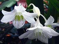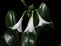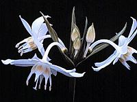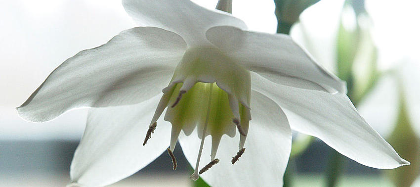 Мы все время говорим «лилия», а ведь совершенно очевидно, что внешне эухарис больше похож не на лилию, а на своего родственника по семейству амариллисовых — нарцисс. Правда, не в обиду поклонникам нарциссов, хочется отметить, что цветок эухариса намного изящней. Благодаря длинной трубке венчик с шестью белоснежными лепестками грациозно свешивается вниз. Тычинки срослись в корону, которая у разных видов отличается по цвету. Корона у Eucharis moorei, например, нежно-кремового цвета, а у Eucharis candida — бело-оранжевая.
