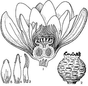 1) схематический рисунок продольного среза цветка; 2) плод; 3-5) переход от тычинки к лепестку.