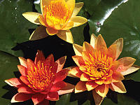 Aurora — Latour-Marliac 1895, n, полусферический, медленно растущий сорт-хамелеон, вначале кремово-жёлтая окраска постепенно становится оранжевой, позже рубиново-красной. Цветки мелкие, диаметром 6,5 см, полумахровые (17-18 лепестков), звёздчатой формы, с едва уловимым ароматом. Листья диаметром 7,5,-8,5 см, тёмно-зелёные с пурпурными пятнами. Разрастается медленно.