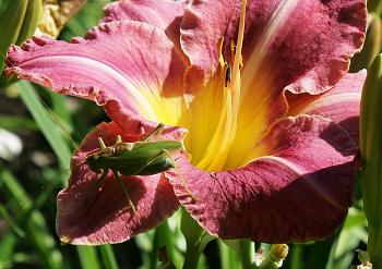 Примерно через полчаса я, вооруженный камерой, вернулся к моему воздыхаемому, любимому цветочку... О, Боже! Что я вижу! Безобразный огрызок!!! Наглое насекомое (кузнечик) с наслаждением пожирал его — абсолютно не смущаясь, поглядывая на меня своими рыбьими глазками. Животик его увеличивался прямо на глазах. Моему возмущению не было предела!
