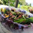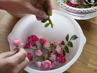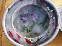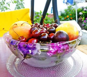2. Погрузите в воду между чашами цветы, ломтики фруктов, травы и др. Лучше, если травы и лепестки будут снизу, а что-то потяжелей (ломтики фруктов, кусочки льда) сверху. Они не дадут всплыть легким элементам. Поставьте чаши в морозильную камеру на ночь или на время замерзания.
