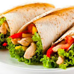 На лепешку положить лист салата, столовую ложку курицы, помидоры, перец, полить сметаной с табаско, завернуть и есть!