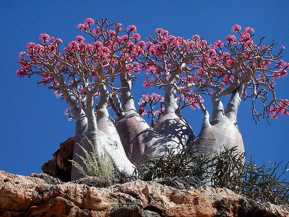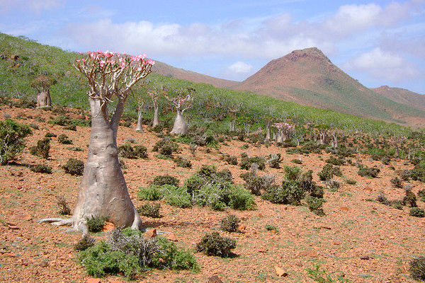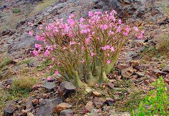 Эндемик острова Сокотра, живая скульптура на фоне каменистого пустынного ландшафта. Это самый рослый и стильный по облику адениум с мощным толстым стволом и короной из небольших веточек с заостренными листьями. От других видов адениума отличается характерными поперечными выпуклыми полосами на стволе.