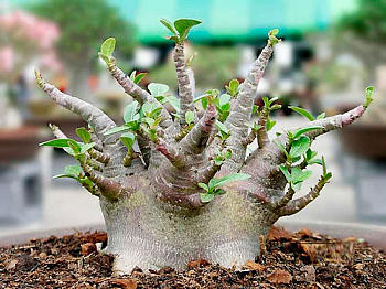 Этот вид адениума красив даже без листьев и цветков. К тому же он нетребователен в культуре, поэтому выращивается так же часто, как адениум тучный. У видовых растений листья бархатистые, но у гибридных растений могут быть и совершенно гладкими.