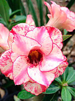 Этот махровый адениум я получила в обмен на парочку своих растений. Увы, такого сорта ни в одном приличном каталоге я не нашла, но так ли это важно? Он мне нравится и безымянный. Цветок громадный, с темно-вишневой каемочкой.