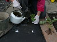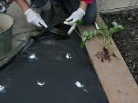 6. Песком или известью наносим на лутрасил метки. Делаем крестообразные разрезы и, подвернув углы внутрь, сажаем укорененные усы земляники. После посадки уголки вынимаем, чтобы они как бы обняли кустик.