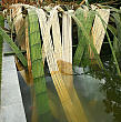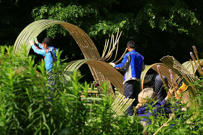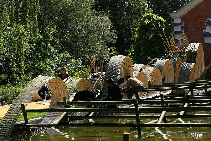 Кропотливая работа по созданию инсталляции продолжалась почти 2 недели. Более 400 стволов бамбука с помощью специального приспособления расщеплялись на полосы, которые соединяли в длинные полотна. Из них и формировались мощные водяные струи и потоки, складывающиеся в огромную соломенно-зеленоватую волну, несущую положительную энергию очищения.