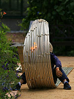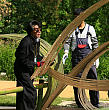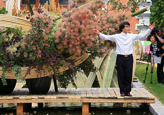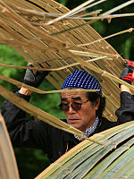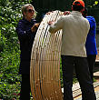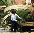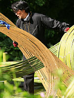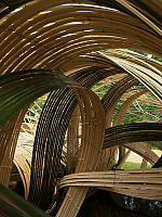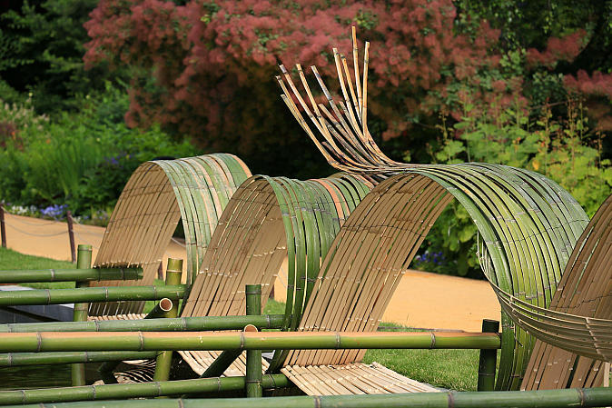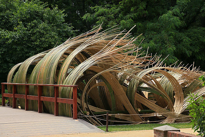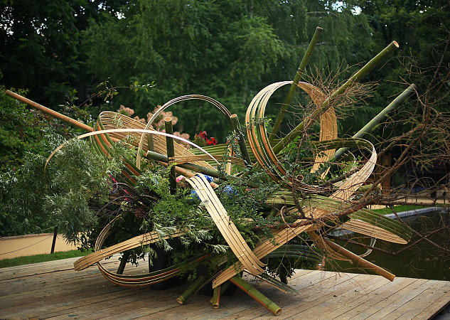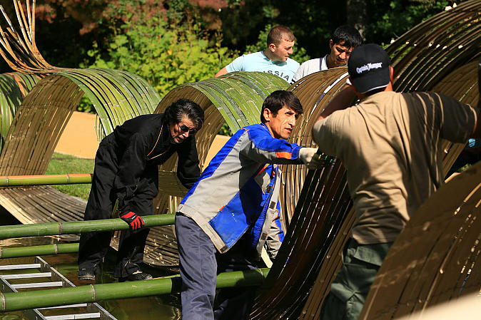 Профессор Школы “Согецу”, господин Кавана, беззаветно предан творческой работе в стиле “Лэнд-арт”, его излюбленным материалом для творения арт-объектов является бамбук.