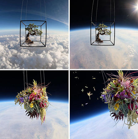 Адзума Макото, художник из Токио запустил цветы в стратосферу. Два ботанических объекта: японский бонсаи и букет из орхидей, гортензий, лилий и ирисов — были запущены в стратосферу в пустыне Невады. "Я хотел видеть движение и красоту растений и цветов, взвешенных в пространстве", — сказал Макото.