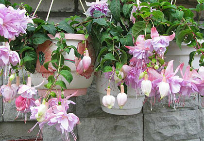 Если ваши фуксии уже растут в темных горшках и вам не хочется лишний раз беспокоить цветущие растения, целесообразно купить белые кашпо большего размера и поставить горшки в них. Кроме того, если растения размещены на южной стороне, между горшком и кашпо необходимо выложить охлаждающий буферный слой из керамзита или торфа.