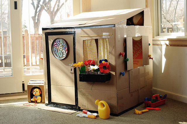 Ну и, конечно, им нужно построить дом. Из картонной коробки. С мебелью и всем необходимым, а вечером включать внутри маленький фонарик, чтобы окошки светились по-настоящему.