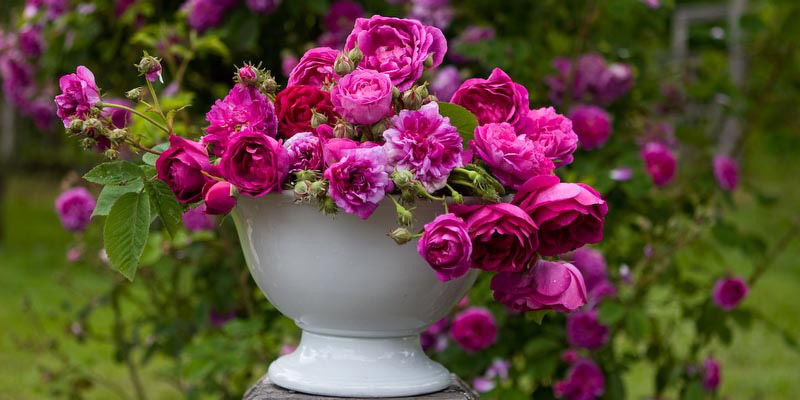 Роза 'Reine De Violettes' (Mille-Mallet, 1860) до сих пор сохранила известность благодаря редкому цвету, который отражен в ее названии. Густомахровые, крупные цветки сложной формы имеют розово-фиолетовую окраску и сильный аромат, унаследованный, скорее всего, от дамасских роз.