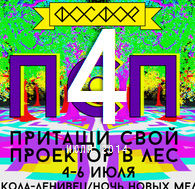 С 4 по 6 июля 2014 Притащи Свой Проектор в лес В рамках фестиваля «Ночь Новых Медиа» пройдет коллективная выставка «Притащи Свой Проектор в лес». Мы приглашаем видеохудожников, new media художников, интерактивщиков и мэпперов показать свои свежие работы в пространстве лесной поляны. Организатор выставки - визуальный лэйбл 4S4R [ФОСФОР].