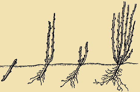 Черенки смородины. В первый год из черенков вырастают 2-3 побега. Рано весной следующего года побеги обрезают, оставляя в длину 12-15 см, и к осени (на второй год после посадки) получают нужные саженцы для высадки на постоянное место.