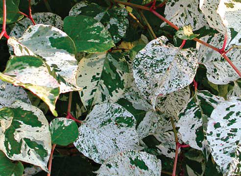 Мне в этом году повезло. Мы с подругой побывали в саду у Татьяны Павловны Шаповал (об этом обязательно напишем) и уговорили хозяйку презентовать нам очень симпатичные череночки горца японского пестролистного (Fallopia japonica 'Variegata'). Куст у Татьяны Павловны изумительный, высотой примерно по пояс, чуть выше, побеги ярко-малиновые, а сердцевидные листочки очаровательно пестрые.