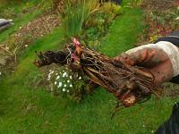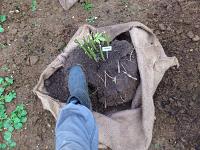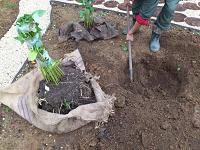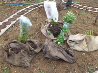Вдвоем переносим кусты, держа мешковину за края