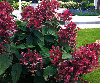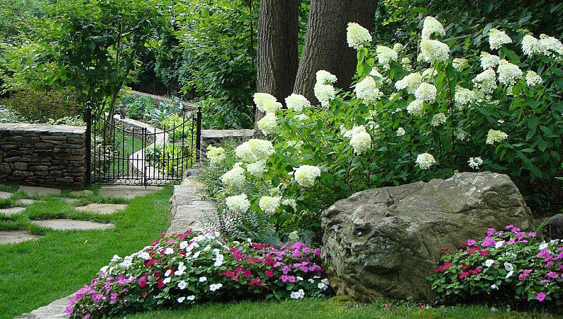 Если высокие гортензии ('Levana', 'Tardiva') "выбегают" на дорожку, создается ощущение волшебного леса