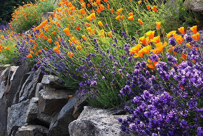- шоковые, или сильноконтрастные, сочетания цветов холодной и теплой гаммы, например, ярко-желтых и красных тюльпанов с синими и голубыми мускари или малинового дербенника с бронзово-оранжевым гелениумом, создают в саду цветовое пятно необычайной силы и яркости. В саду допускается не более одной такой композиции.