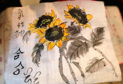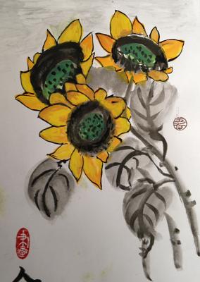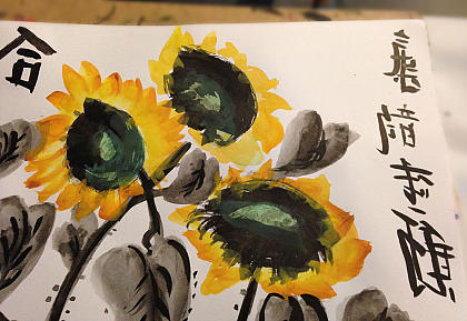 Рисуя в стиле Сеи, важно передать не внешнее сходство предмета, а его сущность. Затем мы перешли к рисованию подсолнухов в стиле Сеи. Для меня сущность подсолнухов в том, что растения несут яркий солнечный свет и плодородие.