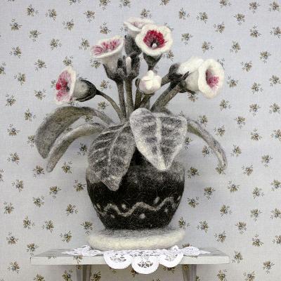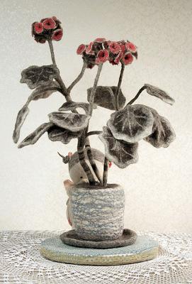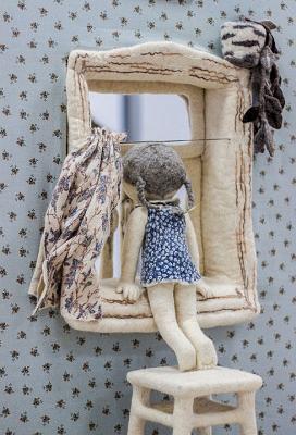 Главная героиня уютной валяной сказки — девочка, живущая в своем мире — среди шкафов, швейных машинок, пианино, диванов, телевизоров, холодильников, велосипедов, домашних растений... Также героями теплых историй часто становятся кошки и птицы. Удивительны интерьеры этих маленьких миров. Они наполнены важными деталями, что и делает картину такой правдоподобно жизненной. На окошке кашпо с хойей, на табуретке горшок глоксинии, а на тумбочке — пеларгония.