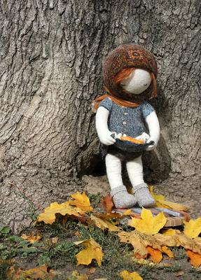 Все вроде просто, тихо и прозрачно. Но приглядитесь, в зимней композиции на голове у снеговика сидит ворона... Прекрасен и осенний сюжет. Что малышка держит в подоле? Может, грибы? А давайте заглянем. Нет, там щенок, котик и медвежонок, которых она то ли подобрала, то ли на прогулку вынесла. Славная душа.