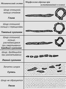 Многие слышали, что механический состав можно ориентировочно определить, скатывая тонкую колбаску из увлажненной почвы. Если она, не трескаясь, сворачивается в колечко — то почва глинистая, если сильно растрескивается — средний суглинок, если не свертывается в кольцо — супесь, а если почва рассыпается, даже не успев скататься в колбаску — то это самая легкая, песчаная почва.