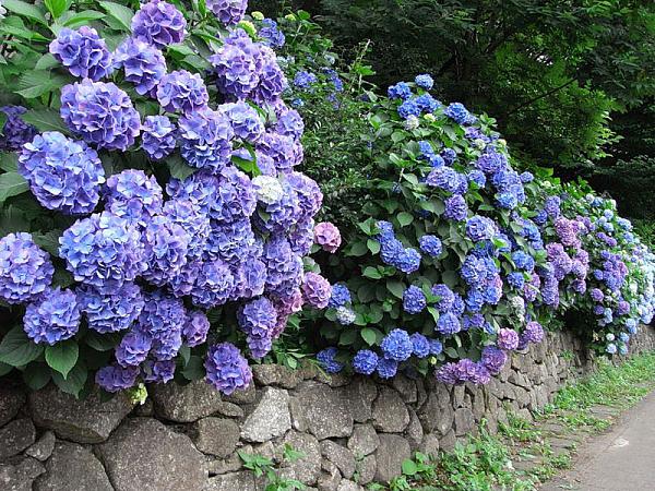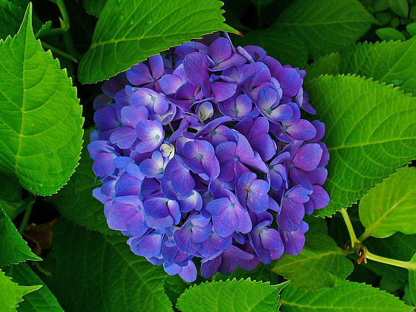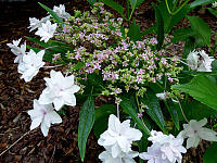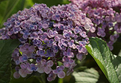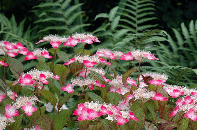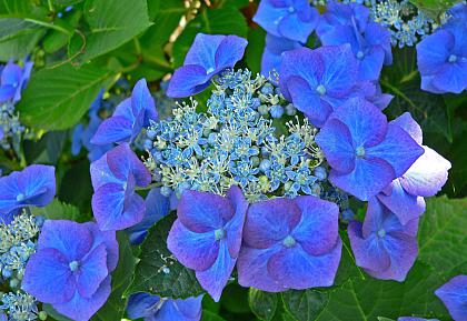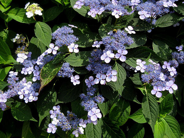 Гортензия пильчатая более морозостойка, чем крупнолистная. Правда, к сожалению, не настолько, чтобы ее не надо было укрывать. У большинства сортов этой гортензии соцветия в форме щитков. В центре расположены фертильные цветки, а по краю стерильные. Такие гортензии сейчас в моде, поскольку они ассоциируются с "природным" садом. Совершенно бесподобен сорт 'Bluebird' — элегантный, прозрачный, с синими-синими цветками.