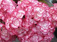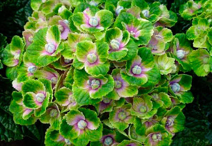 Сейчас появилось множество сортов гортензии садовой с самой причудливой формой и окраской соцветий. Например, японская серия Lady Katsuko удивила цветками, обрамленными белой каймой. А The Masters Collection, тоже японская, поразила еще больше: щитки фертильных цветков окружены венком из махровых стерильных ('Mikawa Chidori', 'Hanabi').