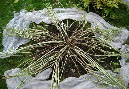 Если оставить листья до весны, они под укрытием превратятся в черную кашу: побеги могут сопреть. Прочистили ветки, и снова утеплите. А в октябре, как установится температура -2…-4 °С, пора усилить укрытие. Способов много. Можно, например, прикрыть побеги лапником и забросать их компостом, стараясь особенно тщательно спрятать верхнюю треть веток. В центр куста тоже стоит набросать компоста, торфа или просто легкой земли, а потом закрыть все двойным слоем плотного нетканого материала.