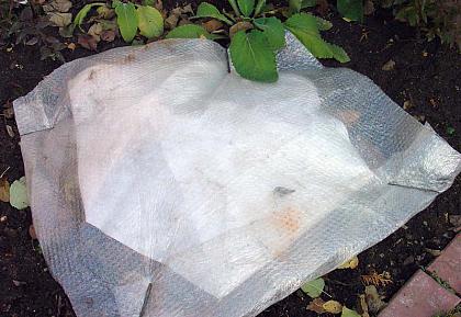 Многие поверх материала кладут пленку. Это немного опасно, потому что повышается вероятность выпревания веток по весне. Зато под пленкой гортензии теплее, и недозревшие побеги получат дополнительный шанс на выживание. Используя пленку, обязательно оставляйте отдушины.