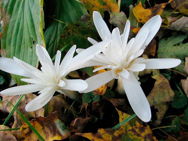 У безвременников все не так, как у других растений: весной отрастают листья (довольно крупные по сравнению с другими луковичными). Они держатся долго, бывает, до конца июля, потом жухнут, прячутся… А в сентябре или позже появляются цветки. У видовых растений — простые, розовые. У многочисленных сортов — белые, махровые.